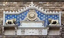 Above the front entrance door, there is a notable ornamental marble frontispiece, dating from 1528. In the middle, flanked by two gilded lions, is the Jesuit symbol, surrounded by a glory, above the text (in Latin): "Rex Regum et Dominus Dominantium" (translation: "King of Kings and Lord of Lords". This text dates from 1851 and does not replace an earlier text by Savonarola[3] as mentioned in guidebooks. Between 1529 and 1851 they were concealed behind a large shield with the grand-ducal coat of arms.