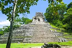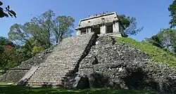 Palenque (Spanish pronunciation: [pa'leŋke]; Yucatec Maya: Bàakʼ [ɓaːkʼ]), also anciently known in the Itza Language as Lakamha ("big water" or "big waters"),[1][2] was a Maya city-state in southern Mexico that perished in the 8th century. The Palenque ruins date from ca. 226 BC to ca. 799 AD. After its decline, it was overgrown by the jungle of cedar, mahogany, and sapodilla trees,[3] but has since been excavated and restored. It is located near the Usumacinta River in the Mexican state of Chiapas, about 130 km (81 mi) south of Ciudad del Carmen, 150 meters (490 ft) above sea level. It is adjacent to the modern town of Palenque, Chiapas. It averages a humid 26 °C (79 °F) with roughly 2,160 millimeters (85 in) of rain a year.[3]
