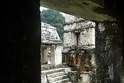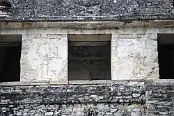 The Temple of the Cross, Temple of the Sun, and Temple of the Foliated Cross are a set of graceful temples atop step pyramids, each with an elaborately carved relief in the inner chamber depicting two figures presenting ritual objects and effigies to a central icon. Earlier interpretations had argued that the smaller figure was that of Kʼinich Janaabʼ Pakal while the larger figure was Kʼinich Kan Bʼahlam. However, it is now known based on a better understanding of the iconography and epigraphy that the central tablet depicts two images of Kan Bʼahlam. The smaller figure shows Kʼinich Kan Bʼahlam during a rite of passage ritual at the age of six (9.10.8.9.3 9 Akbal 6 Xul) while the larger is of his accession to kingship at the age of 48.[19] These temples were named by early explorers; the cross-like images in two of the reliefs actually depict the tree of creation at the center of the world in Maya mythology.