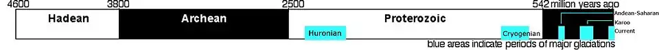 The Precambrian took place between the time when Earth first formed 4.6 billion years (Ga) ago, and 542 million years ago. The Precambrian can be split into two eons, the Archean and the Proterozoic, which can be further subdivided into eras.[27] The reconstruction of the Precambrian climate is difficult for various reasons including the low number of reliable indicators and a, generally, not well-preserved or extensive fossil record (especially when compared to the Phanerozoic eon).[28][29] Despite these issues, there is evidence for a number of major climate events throughout the history of the Precambrian: The Great Oxygenation Event, which started around 2.3 Ga ago (the beginning of the Proterozoic) is indicated by biomarkers which demonstrate the appearance of photosynthetic organisms. Due to the high levels of oxygen in the atmosphere from the GOE, CH4 levels fell rapidly cooling the atmosphere causing the Huronian glaciation. For about 1 Ga after the glaciation (2–0.8 Ga ago), the Earth likely experienced warmer temperatures indicated by microfossils of photosynthetic eukaryotes, and oxygen levels between 5 and 18% of the Earth's current oxygen level. At the end of the Proterozoic, there is evidence of global glaciation events of varying severity causing a 'Snowball Earth'.[30] Snowball Earth is supported by different indicators such as, glacial deposits, significant continental erosion called the Great Unconformity, and sedimentary rocks called cap carbonates that form after a deglaciation episode.[31]
