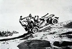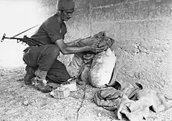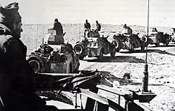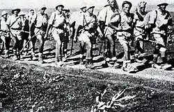 The Palmach was established by the Haganah High Command in May 1941. Its aim was to defend the Palestinian Jewish community against two potential threats. Firstly the occupation of Palestine by the Axis in the event of their victory over the British in North Africa. Secondly, if the British army were to retreat from Palestine, Jewish settlements might come under attack from the Arab population. Yitzhak Sadeh was named as Palmach commander.[2] Initially the group consisted of around one hundred men. In the early summer of 1941 the British military authorities agreed to joint operations against Vichy French forces in Lebanon and Syria. The first action was a sabotage mission (Operation Boatswain) against oil installations at Tripoli, Lebanon.[3] Twenty-three Palmach members and a British liaison officer set out by sea but were never heard of again.[4] On 8 June mixed squads of Palmach and Australians began operating in Lebanon and Syria. The success of these operations led the British GHQ to fund a sabotage training camp for three hundred men at Mishmar HaEmek. Since the Palmach consisted of unpaid volunteers, the funding was used to cover the needs of twice that number of men.[5] When the British ordered the dismantling of Palmach after the Allied victory at the Second Battle of El Alamein in 1942, the organization went underground.