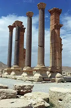 - The Tetrapylon was erected during the renovations of Diocletian at the end of the third century.[86] It is a square platform and each corner contains a grouping of four columns.[36] Each column group supports a 150-ton cornice and contains a pedestal in its center that originally carried a statue.[36] Out of sixteen columns, only one is original while the rest are from reconstruction work by the Syrian Directorate-General of Antiquities in 1963, using concrete.[151] The original columns were brought from Egypt and carved out of pink granite.[36]