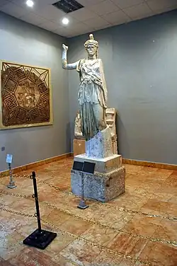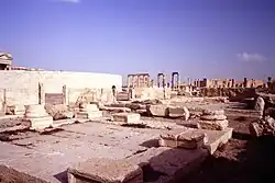 The Temple of Nabu and the Roman theater were built on the colonnade's southern side.[36] Behind the theater were a small senate building and the large agora, with the remains of a triclinium (banquet room) and the Tariff Court.[37] A cross street at the western end of the colonnade leads to the Camp of Diocletian,[25][38] built by Sosianus Hierocles (the Roman governor of Syria in the reign of Diocletian).[39] Nearby are the Temple of Al-lāt and the Damascus Gate.[40]