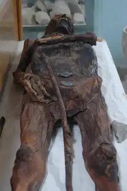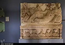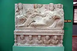 Palmyra had a large agora.[note 10] However, unlike the Greek Agoras (public gathering places shared with public buildings), Palmyra's agora resembled an Eastern caravanserai more than a hub of public life.[100][101] The Palmyrenes buried their dead in elaborate family mausoleums,[102] most with interior walls forming rows of burial chambers (loculi) in which the dead, lying at full length, were placed.[103][104] A relief of the person interred formed part of the wall's decoration, acting as a headstone.[104] Sarcophagi appeared in the late second century and were used in some of the tombs.[105] Many burial monuments contained mummies embalmed in a method similar to that used in Ancient Egypt.[106][107]