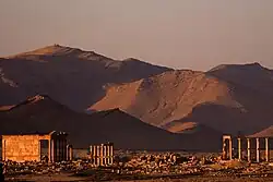Palmyra began as a small Neolithic settlement near the Efqa spring on the southern bank of Wadi al-Qubur.[20] The much later Hellenistic settlement of Palmyra was also located near the Efqa spring on the southern bank of Wadi al-Qubur.[20] It had its residences expanding to the wadi's northern bank during the first century.[16] Although the city's walls at the time of Zenobia originally enclosed an extensive area on both banks of the wadi,[16] the walls rebuilt during Aurelian's reign surrounded only the northern-bank section.[21][16] Most of the city's monumental projects were built on the wadi's northern bank,[22] among them is the Temple of Bel, on a tell which was the site of an earlier temple (known as the Hellenistic temple).[23] However, excavation supports the theory that the tell was originally located on the southern bank, and the wadi was diverted south of the tell to incorporate the temple into Palmyra's late first and early second century urban organization on the north bank.[24]