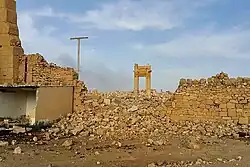 - The Temple of Nabu is largely ruined.[145] The temple was Eastern in its plan; the outer enclosure's propylaea led to a 20-by-9-metre (66 by 30 ft) podium through a portico of which the bases of the columns survives.[143] The peristyle cella opened onto an outdoor altar.[143]