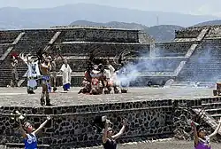Similar to the Olympic flame, the Pan American Games flame is lit well before the Games are to commence. The flame was lit for the first games in Olympia, Greece. For subsequent games, the torch has been lit during the simulation of the Aztec new fire ceremony held during the Mezoamerican period, the ceremonies here held first in the Cerro de la Estrella National Park in Mexico City and later they moved the ceremony to the Pyramid of the Sun located in Teotihuacan Pyramids Complex.[25] The only exception was for the São Paulo games in 1963, when the torch was lit in Brasília by the indigenous Guaraní people and two ways were held as the country also hosted the 1963 Summer Universiade in Porto Alegre. An Aztec older then lights the torch of the first relay bearer, thus initiating the Pan American torch relay that will carry the flame to the host city's main stadium, where it plays an important role in the opening ceremony.[7] Since 2011, the flame is required to be held during the games in the stadium which will host the athletics competition. If the Opening ceremony and athletics competition will be held in different stadiums, the flame will be required to move from one stadium to the other. Exceptions occurred in the 1987, 1999, 2007 and 2015 Games when they have only one cauldron. In some cases the flame burn in a cauldron placed outside the main stadium.[7]