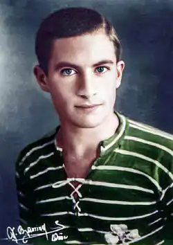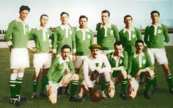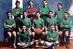 Panathinaikos won undefeated the Championship of 1929–30 under the guidance of József Künsztler and Angelos Messaris as the team's star player.[23] Other notable players of this Belle Époque period of the team were Antonis Migiakis, Diomidis Symeonidis, Mimis Pierrakos and Stefanos Pierrakos, among others. They thrashed rivals Olympiacos 8–2, a result that still remains the biggest win either team has achieved against its rival, with Messaris scoring three goals.[24] The team also defeated Aris 1–4 away in Thessaloniki. Messaris, who scored again three goals, became a hero and chant for the fans.