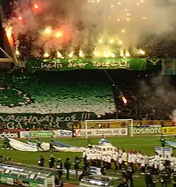 Panathinaikos was founded in 1908 as "Podosfairikos Omilos Athinon" (Football Club of Athens) by Giorgos Kalafatis.[1][2] They play in Super League Greece, being one of the most successful clubs in Greek football and one of the three clubs which have never been relegated from the top division. Among their major titles are 20 Greek Championships, 20 Greek Cups, achieving eight times the Double and 3 Greek Super Cups.[3][4] They are also one of three clubs to win a Greek championship undefeated, going without a loss in a top-flight campaign in the 1963–64 season. Panathinaikos is the only Greek team that has reached the UEFA Champions League final in 1971 (which they lost to Ajax 2–0), and also the semi-finals twice, in 1985 and 1996. It is also the only Greek team that has played for the Intercontinental Cup (1971). Furthermore, they have reached the quarter-finals of the Champions League on another two occasions (in 1992 and 2002), as well as the quarter-finals of the UEFA Cup twice (1988 and 2003). They have also won the Balkans Cup in 1977. According to research and polls, Panathinaikos is the most popular football team in Greece.[5][6][7] Panathinaikos is also a member of the European Club Association.