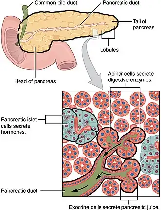 The exocrine group is dominated by pancreatic adenocarcinoma (variations of this name may add "invasive" and "ductal"), which is by far the most common type, representing about 85% of all pancreatic cancers.[2] Nearly all these start in the ducts of the pancreas, as pancreatic ductal adenocarcinoma (PDAC).[31] This is despite the fact that the tissue from which it arises – the pancreatic ductal epithelium – represents less than 10% of the pancreas by cell volume, because it constitutes only the ducts (an extensive but capillary-like duct-system fanning out) within the pancreas.[32] This cancer originates in the ducts that carry secretions (such as enzymes and bicarbonate) away from the pancreas. About 60–70% of adenocarcinomas occur in the head of the pancreas.[2]