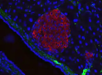 ![]() A pancreatic islet from a mouse in a typical position, close to a blood vessel; insulin in red, nuclei in blue. | |