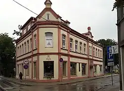 Panevėžys also was a center of operations by local knygnešiai (book smugglers).[26][27] In 1880, Naftalis Feigenzonas established the first printing house in Panevėžys.[28] At the end of the book prohibition, one of the Lithuanian book smugglers – *Juozas Masiulis – in 1905 opened the first Lithuanian bookstore and printing house.[13] The building is still a landmark of Panevėžys, and local people are proud of this heritage, symbolized in a bookstore that has been functional for more than 100 years.[29]