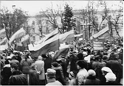 In 1944, the city was yet again occupied by the Soviet Union leading to a new wave of political exiles and killings.[13][14] The Lithuanian partisans of the Vytis military district actively operated in the Panevėžys County from 1944 and militarily confronted with the Soviet forces in notable battles, however following the death of chief Bronius Karbočius in 1953 the staff of the Vytis military district was not restored and the last partisans were killed in action in 1956.[41][42]