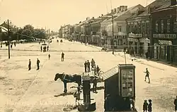 Volunteers of the Lithuanian Armed Forces had liberated the city for the first time from the Bolsheviks' forces on 27 March 1919 during the Lithuanian Wars of Independence and raised flags of Lithuania.[30] Before the Second World War Panevėžys was multicultural city with Lithuanian, Jewish, Polish, Russian, German, Karaite, Tatar and other city communities. Between the World Wars, in the newly independent Lithuania, Panevėžys continued to grow.[13] According to the Lithuanian census of 1923, there were 19,147 people in Panevėžys (19,197 with suburbs), among them 6,845 Jews (36%) (in Yiddish the town's name was פּאָניוועזש, transliterated as Ponevezh).[13][31]
