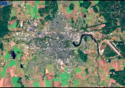 Panevėžys (Lithuanian pronunciation: [pɐnʲɛvʲeːˈʑiːs] ⓘ) is the fifth-largest city in Lithuania.[4][5] As of 2021, it occupies 50 square kilometres (19 sq mi) with 89,100 inhabitants. As defined by Eurostat the population of the Panevėžys functional urban area that stretches beyond the city limits is estimated at 124,412 (as of 2022).[3]