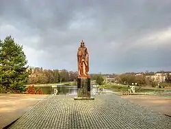 Panevėžys was first mentioned evidently on 7 September 1503 in documents signed by the Grand Duke Alexander Jagiellon, who granted the town building rights to construct a church and other structures.[13][14][12] Alexander Jagiellon is considered as the founder of the city, which celebrated its 500th anniversary in 2003; two renowned monuments were built in the city for this anniversary, one of which, by Stanislovas Kuzma, is dedicated to Alexander Jagiellon.[15][16]
