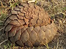 The physical appearance of a pangolin is marked by large, hardened, overlapping, plate-like scales, which are soft on newborn pangolins, but harden as the animal matures.[27] They are made of keratin, the same material from which human fingernails and tetrapod claws are made, and are structurally and compositionally very different from the scales of reptiles.[28] The pangolin's scaled body is comparable in appearance to a pine cone. It can curl up into a ball when threatened, with its overlapping scales acting as armor, while it protects its face by tucking it under its tail. The scales are sharp, providing extra defense from predators.[29] Despite their appearance, they are not closely related to armadillos, having both evolved scales by convergent evolution.