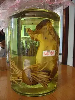 Though pangolins are protected by an international ban on their trade, populations have suffered from illegal trafficking due to beliefs in East Asia that their ground-up scales can stimulate lactation or cure cancer or asthma.[74] In the past decade, numerous seizures of illegally trafficked pangolin and pangolin meat have taken place in Asia.[75][76][77][78] In one such incident in April 2013, 10,000 kg (22,000 pounds) of pangolin meat were seized from a Chinese vessel that ran aground in the Philippines.[79][80] In another case in August 2016, an Indonesian man was arrested after police raided his home and found over 650 pangolins in freezers on his property.[81] The same threat is reported in Nigeria, where the animal is on the verge of extinction due to overexploitation.[82] The overexploitation comes from hunting pangolins for game meat and the reduction of their forest habitats due to deforestation caused by timber harvesting.[83] The pangolin are hunted as game meat for both medicinal purposes and food consumption.[83]