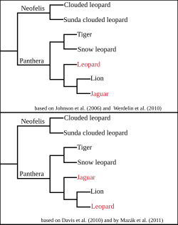 - ^ a b Davis, B.W.; Li, G.; Murphy, W.J. (2010). "Supermatrix and species tree methods resolve phylogenetic relationships within the big cats, Panthera (Carnivora: Felidae)". Molecular Phylogenetics and Evolution. 56 (1): 64–76. Bibcode:2010MolPE..56...64D. doi:10.1016/j.ympev.2010.01.036. PMID 20138224.