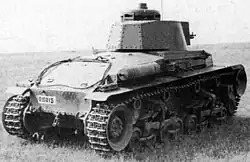 The turret ring had a diameter of 1.267 metres (49.9 in). The turret had a flat face in the center of which was mounted the 3.72-centimetre (1.46 in) main gun. On the right side was another 7.92-millimetre (0.312 in) machine gun in a ball mount. The commander had four episcopes in his cupola and a monocular mirror, 1.3 × 30° periscope which he could extend, once he had removed its armoured cover in his hatch, to give vision while "buttoned-up".[5] As the sole occupant of the turret, the commander was responsible for loading, aiming and firing the main gun and the turret machine gun while simultaneously commanding the tank. The Germans added an extra crewman on the right side of the turret to load the main gun and to operate the turret machine gun. Some ammunition had to be removed to accommodate him.[6]