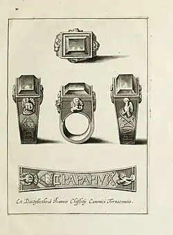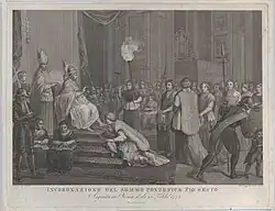 From the 11th century, excluding the Avignon Papacy, there existed a ceremony of taking possession of the Lateran which had special significance in the Church.[40] The Vita of Paschal II (elected 1099) and the Vita of Honorius II (elected 1124), and other ceremonial books from the 12th century, describes how the pope, after his election and having been bestowed with the Papal mantum, rode to the Lateran Basilica. He was first conducted to a stone seat known as the "dunged seat" (stercorata, a symbol of humility referencing being raised "from the ash heap" as in 1 Samuel 2:8) placed at the entrance of the basilica, where he threw gold and silver coins to the people saying "this gold and silver are not given me for my own pleasure; what I have, I will give to you." The pope was then led to the throne in the apse of the church, where he received the cardinals at his feet and the kiss of peace. The pope proceeded to the Lateran Palace where he reclined on two red marble chairs placed together, representing Saints Peter and Paul and imitating Byzantine imperial custom. The pope was handed the papal ferula, the keys to the Lateran Basilica and Palace (representing also the power of binding and loosing in Matthew 18:18), and girded with a red cincture attached with a purple pouch containing musk (symbolising the "aroma of Christ" in 2 Corinthians 2:15-16) and seven or twelve seals, representing the Seven gifts of the Holy Spirit or the twelve apostles. He then returned the ferula and received the officials of the Palace. Standing up, he again scattered silver coins to the people, saying "he scatters abroad, he gives to the poor, his righteousness endures for ever (2 Corinthians 9:9)."[40] After a stampede during Pope Pius IV's enthronement, Pope Pius V changed the ceremony, assembling the poor at Campo Santo and handed each 3 giuli instead of tossing coins. Gregory XIII and Sixtus V replaced the ceremony with donations to charity institutions.[41] During the Avignon Papacy, the Lateran chairs were left behind in Rome and unused; much of this ceremony was later abandoned entirely from Pope Leo X onward.[40][42]