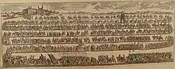 From Leo X's enthronement, the splendour of the procession to the Lateran itself became the focus of the ceremony rather than specific actions.[43] The later enthronement focused on a horseback procession from the Vatican to the Lateran, preceded by the Blessed Sacrament on a white horse and under a baldachin,[43] and light cavalry who cleared the way. The papal court, including the pope's domestic servants as well as barons and princes, rode with the pope. The pope, carrying the Golden Rose, proceeded on a white horse, whose bridle was held by a prince or barons, while the pope's cross was carried before him. Popes unable to ride were carried in a litter. Upon approaching the Lateran, the canons presented the pope with the two gold and silver keys to the basilica presented on a gilt bowl covered with flowers. He then ascended a throne at the entrance of the church, received the obeisance of the canons, and then was carried to the altar where he prayed and gave his blessing to the people. The pope again gave his blessing outside the church before changing to his ordinary dress and retiring.[44][43][45] The procession was retained in its original splendour as late as Pope Pius IX's enthronement in 1846, who used a carriage instead of a white horse.[46][47] During the "prisoner in the Vatican" period that followed, the enthronement in the Lateran did not take place.[48]