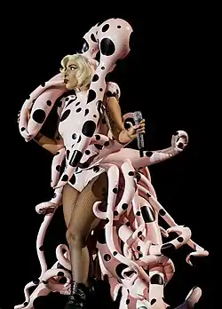 During the ArtRave: The Artpop Ball tour (2014), Gaga performed "Paparazzi" dressed up in a polka-dotted rubber outfit with tentacles growing out around her waist and her head. Rob Sheffield from Rolling Stone described her look as "an inflatable rubber order of fried calamari growing out of her spine",[85] while Adam Carlson from Billboard said that the outfit made Gaga look like a "dancing Ursula from The Little Mermaid ".[86] The song was added to the setlist of the Joanne World Tour (2017–2018), where she was wearing a red leather bodysuit and tassel leather boots, and the performance ended with a choreographed attack on Gaga by her dancers.[87][88]