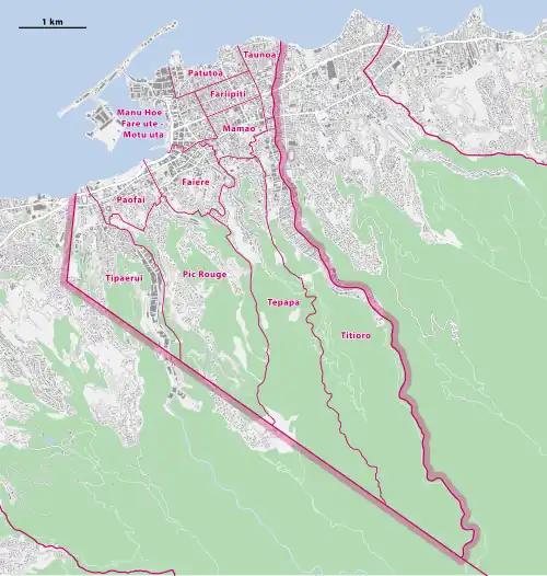 The commune of Papeʻetē is subdivided into eleven quartiers (wards):[9][10][11]