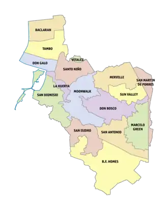 Parañaque is situated in the southern portion of Metro Manila.[22] It is subdivided into two distinct districts, each of which contains eight barangays. The 1st District consists of Baclaran, Tambo, Don Galo, Santo Niño, La Huerta, San Dionisio, San Isidro and Vitalez, while the 2nd District consists of Barangays BF Homes, San Antonio, Marcelo Green, Sun Valley, Don Bosco, Moonwalk, Merville and San Martin de Porres.
