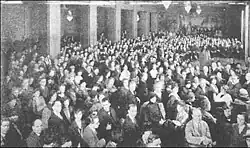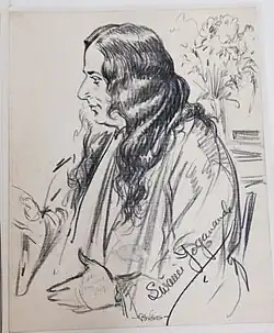 In his autobiography, Yogananda writes that he received a vision one day in 1920 while meditating at his Ranchi school: faces of a multitude of Americans passed before his mind's eye, intimating to him that he would soon go to America.[18] After giving charge of the school over to its faculty (and eventually to his childhood friend Swami Satyananda),[19] he left for Calcutta. On the following day, he received an invitation from the American Unitarian Association to serve as India's delegate to an International Congress of Religious Liberals convening that year in Boston.[20] Yogananda sought his guru's advice, and Sri Yukteswar advised him to go. According to Philip Goldberg, Yogananda shared the following account in his Autobiography of a Yogi. While in deep prayer in his room, he received a surprise visit from Mahavatar Babaji, the foremost guru of his lineage, who told him directly that he was the one chosen to spread Kriya Yoga to the West. Reassured and uplifted, Yogananda soon afterwards accepted the offer to go to Boston. This account became a standard feature of his lectures.[3][8][21]