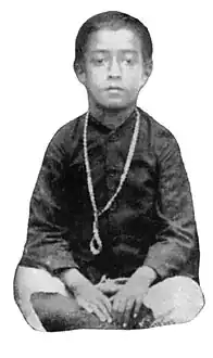 Yogananda was born Mukunda Lal Ghosh in Gorakhpur, Uttar Pradesh, India, to a Hindu Bengali Kayastha family.[16] He was the fourth of eight children and second of four sons of Bhagabati Charan Ghosh, the vice president of Bengal-Nagpur Railway, and Gyanprabha Devi. According to his younger brother Sananda, Mukunda's spiritual awareness and experiences were far beyond the ordinary even from his earliest years.[16] His father's job required the family to move several times during Mukunda's childhood, including to Lahore, Bareilly, and Kolkata.[3] According to Autobiography of a Yogi, he was eleven years old when his mother died, just before the marriage of his eldest brother, Ananta. She left behind a sacred amulet for Mukunda, given to her by a holy man, who told her that Mukunda was to possess it for some years, after which it would vanish into the ether from which it came. Throughout his childhood, his father would fund train passes for his many sight-seeing trips to distant cities and pilgrimage spots, which he would often take with friends. In his youth he sought out many of India's Hindu sages and saints, including the Soham "Tiger" Swami, Gandha Baba, and Mahendranath Gupta, hoping to find an illumined teacher to guide him in his spiritual quest.[3]