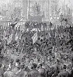 A few candidates, including Blanqui (who had been arrested when outside Paris, and was in prison in Brittany), won in several arrondissements. Other candidates who were elected, including about twenty moderate republicans and five radicals, refused to take their seats. In the end, the council had just 60 members. Nine of the winners were Blanquists (some of whom were also from the International); twenty-five, including Delescluze and Pyat, classified themselves as "Independent Revolutionaries"; about fifteen were from the International; the rest were from a variety of radical groups. One of the best-known candidates, Clemenceau, received only 752 votes. The professions represented in the council were 33 workers; five small businessmen; 19 clerks, accountants and other office staff; twelve journalists; and a selection of workers in the liberal arts. 20 members were Freemasons.[45] All were men; women were not allowed to vote.[46] The winners were announced on 27 March, and a large ceremony and parade by the National Guard was held the next day in front of the Hôtel de Ville, decorated with red flags.