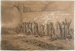 The various Communards had little more than two months to achieve their respective goals before the national French Army suppressed the Commune during the semaine sanglante ("bloody week") beginning on 21 May 1871. The national forces still loyal to the Third Republic government either killed in battle or executed an estimated 10,000 to 15,000 Communards, though one unconfirmed estimate from 1876 put the toll as high as 20,000.[5] In its final days, the Commune executed the Archbishop of Paris, Georges Darboy, and about one hundred hostages, mostly gendarmes and priests.
