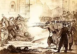 At midday on 22 January, three or four hundred National Guards and members of radical groups—mostly Blanquists—gathered outside the Hôtel de Ville. A Garde Mobile battalion from Brittany was inside the building to defend it in case of an assault. The demonstrators presented their demands that the military be placed under civil control, and that there be an immediate election of a commune. The atmosphere was tense, and in the middle of the afternoon, gunfire broke out between the two sides; each side blamed the other for firing first. Six demonstrators were killed, and the army cleared the square. The government quickly banned two publications, Delescluze's Le Reveil and Pyat's Le Combat, and arrested 83 revolutionaries.[23]