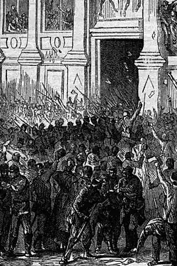 On 22 March 1871, demonstrators holding banners declaring them to be "Friends of Peace" were blocked from entering the Place Vendôme by guardsmen who, after being fired on, opened fire on the crowd. At least 12 people were killed and many wounded.[40] The event was labeled the Massacre in the Rue de la Paix.[41]