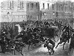 "Every night, isolated barricades were thrown up, constructed for the most part out of disused conveyances, especially omnibuses, a few shots were fired at random, and scenes of disorder were taken part in by a few hundreds of persons, mostly quite young".