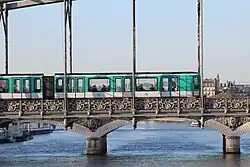 ![]() Line 6 train running on the Pont de Bir-Hakeim near the Eiffel Tower | |||