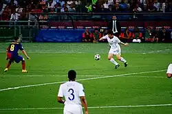 Park jetted off to captain South Korea in the 2011 AFC Asian Cup and missed seven games for United after the turn of the year.[76] Upon his return from the subsequent tournament, he was ruled out for one month due to an hamstring injury which occurred during training. He returned to action for the first time since Boxing Day on 2 April, playing 64 minutes of a 4–2 away win over West Ham United.[77] On 12 April 2011, Park scored his first goal since the turn of the year when he scored the winning goal in the Champions League quarter-final second leg tie against Chelsea, ending in a 2–1 win.[78] On 8 May, Park assisted Javier Hernández's opening goal with an accurate through-ball just 36 seconds after the start of the crucial match, which virtually decided United's league title with a 2–1 victory over rivals Chelsea.[79] On 22 May, he scored a goal and set up the second goal for Anderson in the last match of the season against Blackpool. Park played in another Champions League final, against Barcelona in 2011, which United lost 3–1.