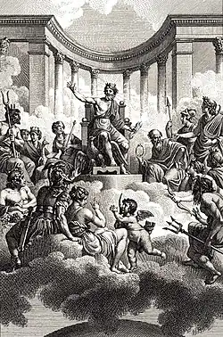 Fragments 10 and 11, which are introductory to cosmology, confirm what is expressed by the testimonies, at least with regard to the Sun, the Moon, and the sky, although it also includes the aether, the stars, the constellations (n.b.: the word σήματα used by Parmenides can mean both "constellations" and "signs")[56] and the Milky Way, and mythical elements such as Mount Olympus. The Parmenidean goddess presents a cosmic order in fr. B12[149] and the summary of Aetius[150] that is extremely difficult to reconstruct, due to the scarcity and obscurity of the fragments.[56][151][56] The beginning of fragment 12 and the testimony of Aetius [152] introduce into cosmology certain "rings"[153]) The existence of concentric rings of a diverse nature is postulated as the structure of the cosmos: some rings were of pure fire and others of a mixture of fire and darkness, the rings closer to the center participated more in fire, while those further from the center were more filled with night. There are also rarified and dense ones. Surrounding everything is a solid wall. The doctrine of the rings seems to be the influence of Anaximander[154] and of Hesiod,[155] who speaks of the "crowned" sky and the stars. At the center of the system, an unnamed daimon[156] coordinates all the cosmological elements, both sensible opposites and Necessity, and presides over the mixture and attraction of the sexes, and the "abhorrent" birth.[157] Plutarch[158] calls her Aphrodite, before citing fragment 13 of her, which marks her as the mother of Eros, while Aetius identifies her with Ananke and also Dike, Δίκη, present in the proem, here presiding over movement and birth.
