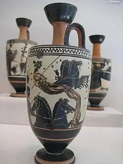 The proem, begins with the description of a trip in a two-wheeled chariot (v. 7), pulled by a pair of mares, described as πολύφραστοι (polýphrastoi, v. 4), "attentive" or "knowledgeable". The image recalls the divine steeds of Achilles, sometimes even endowed with a voice.[59] Pindar also gives us a similar image of draft beasts "leading" along a "pure path" or "luminous"[60][61] There are so many common elements between the compositions that Bowra considers that either Pindar's mimics Parmenides's—it is later, from 468 BC—, or, what he considers more likely, that they have a common source from which they are both influenced.[62] Everything seems to suggest that the chariot is directed by superior powers, and we must rule out, as Jaeger says,[63] the platonizing interpretation of Sextus Empiricus, inspired by the myth of the "winged chariot" narrated in the Phaedrus (246 d 3 – 248 d), in which the chariot symbolizes the human soul. Surely the composition has a closer relationship with the myth of the death of Phaethon, since both this and the charioteers of this Parmenidean chariot are children of the Sun, and the path that is traveled is that of Night and Day (v. 11). It is the same "solar chariot."[64]