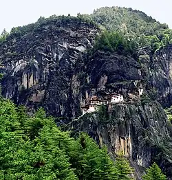 Paro Taktsang (Dzongkha: སྤ་གྲོ་སྟག་ཚང་, also known as the Taktsang Palphug Monastery and the Tiger's Nest)[1] is a sacred Vajrayana Himalayan Buddhist site located in the cliffside of the upper Paro valley in Bhutan. It is one of thirteen Tiger's Nest caves in historical Tibet in which Padmasambhava practiced and taught Vajrayana.[2]