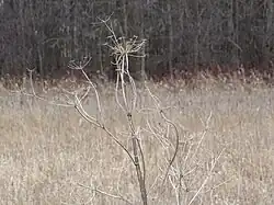 Previous-year growth of wild parsnip as seen in the spring. Invasive specimen photographed in Ottawa, Ontario.