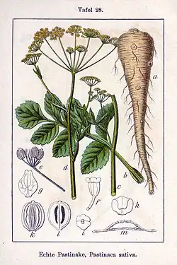 Several species from other genera (Anethum, Elaphoboscum, Peucedanum, Selinum) are likewise synonymous with the name Pastinaca sativa.[13]