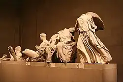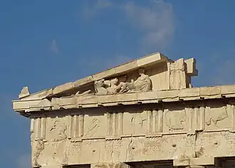 The east pediment originally contained 10 to 12 sculptures depicting the Birth of Athena. Most of those pieces were removed and lost during renovations in either the eighth or the twelfth century.[119] Only two corners remain today with figures depicting the passage of time over the course of a full day. Tethrippa of Helios is in the left corner and Selene is on the right. The horses of Helios's chariot are shown with livid expressions as they ascend into the sky at the start of the day. Selene's horses struggle to stay on the pediment scene as the day comes to an end.[120][121]