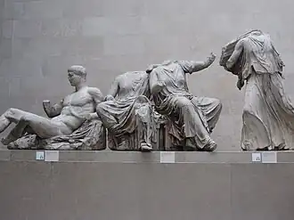 The supporters of Athena are extensively illustrated at the back of the left chariot, while the defenders of Poseidon are shown trailing behind the right chariot. It is believed that the corners of the pediment are filled by Athenian water deities, such as the Kephisos river, the Ilissos river, and nymph Kallirhoe. This belief emerges from the fluid character of the sculptures' body position which represents the effort of the artist to give the impression of a flowing river.[122][123] Next to the left river god, there are the sculptures of the mythical king of Athens (Cecrops or Kekrops) with his daughters (Aglaurus, Pandrosos, Herse). The statue of Poseidon was the largest sculpture in the pediment until it broke into pieces during Francesco Morosini's effort to remove it in 1688. The posterior piece of the torso was found by Lusieri in the groundwork of a Turkish house in 1801 and is currently held in the British Museum. The anterior portion was revealed by Ross in 1835 and is now held in the Acropolis Museum of Athens.[124]