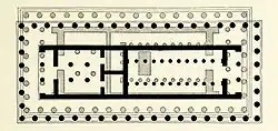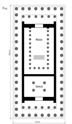 The Parthenon's interior displays several unusual and innovative features. The northern peristyle contained an archaic naiskos and altar, preserved to maintain religious continuity on the site.[70] The Parthenon's porticos are unusually shallow, and the naos includes a second step. The rear room (opisthodomos) was wider, a Cycladic trait, and held four columns, likely Ionic or Corinthian.[71] Large doors connected the rooms, and the only pronaos had tall windows (about 3 m high and 2.5 m wide), a rare feature in Greek architecture. The north window also served as a landing for a staircase within the thick wall leading to the attic. Other irregularities include varying abacus lengths, deliberate interaxial differences of up to 4.8 cm, and uneven architrave blocks are misaligned and differ by as much as 18 cm.[72] Scholars interpret these changes variously—as adjustments for corner contraction (Dinsmoor),[73] evidence of a mid-construction design change (Wesenberg),[74] or signs of improvisation when an Ionic frieze replaced an intended Doric one (Korres).