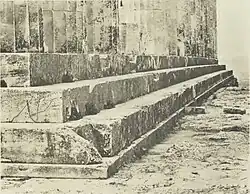 The existence of both the proto-Parthenon and its destruction were known from Herodotus,[53] and the drums of its columns were visibly built into the curtain wall north of the Erechtheion. Further physical evidence of this structure was revealed with the excavations of Panagiotis Kavvadias of 1885–1890. The findings of this dig allowed Wilhelm Dörpfeld, then director of the German Archaeological Institute, to assert that there existed a distinct substructure to the original Parthenon, called Parthenon I by Dörpfeld, not immediately below the present edifice as previously assumed.[54] Dörpfeld's observation was that the three steps of the first Parthenon consisted of two steps of Poros limestone, the same as the foundations, and a top step of Karrha limestone that was covered by the lowest step of the Periclean Parthenon. This platform was smaller and slightly to the north of the final Parthenon, indicating that it was built for a different building, now completely covered over. This picture was somewhat complicated by the publication of the final report on the 1885–1890 excavations, indicating that the substructure was contemporary with the Kimonian walls, and implying a later date for the first temple.[55]