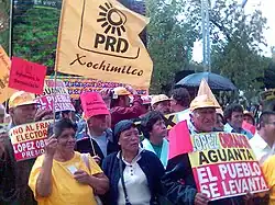 The Party of the Democratic Revolution (Spanish: Partido de la Revolución Democrática [paɾˈtiðo ðe la reβoluˈsjon demoˈkɾatika], PRD) is a state-level[18] social democratic[19][20] political party in Mexico (previously national, until 2024).[21] The PRD originated from the Democratic Current, a political faction formed in 1986 from the Institutional Revolutionary Party (PRI).[22] The PRD was formed after the contested general election in 1988, which the PRD's immediate predecessor, the National Democratic Front, believed was rigged by the PRI. This sparked a movement away from the PRI's authoritarian rule.[23]