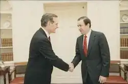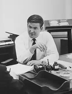 During the course of Nixon's presidency, Buchanan became entrusted on press relations, policy positions, and political strategy.[18] Early on during Nixon's presidency, Buchanan worked as a White House assistant and speechwriter for Nixon and Vice President Spiro Agnew. He coined the phrase "Silent Majority," and helped shape the strategy that drew millions of Democrats to Nixon. In a 1972 memo, he suggested the White House "should move to re-capture the anti-Establishment tradition or theme in American politics."[19] His daily assignments included developing political strategy, publishing the President's Daily News Summary, and preparing briefing books for news conferences. He accompanied Nixon on his trip to China in 1972 and the summit in Moscow, Yalta and Minsk in 1974. He suggested that Nixon label Democratic opponent George McGovern an extremist and burn the White House tapes.[20] Buchanan later argued that Nixon would have survived the Watergate scandal with his reputation intact if he had burnt the tapes.[21]