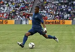 Evra returned to the team in November 2006 for the team's friendly match against Greece. He appeared as a half-time substitute for Abidal as France won the match 1–0.[180] After going another year without representing France, Evra began appearing as a regular under Domenech in 2007. On 28 May 2008, he was included in the squad to participate in UEFA Euro 2008.[181] He was initially placed onto the squad to serve as back-up to Abidal, however after failing to appear in the team's opening 0–0 draw with Romania, there were calls from the French media urging Domenech to insert Evra into the starting line-up at the behest of Abidal.[182][183][184] Domenech relented and started Evra in the team's next match against the Netherlands, which ended in a 4–1 defeat.[185][186] In the must-win final group stage match against Italy, Evra started his second consecutive match, but France lost 2–0 and were eliminated from the competition in the first round.[187] Following the match, cameras witnessed Evra and teammates Patrick Vieira and Abidal getting into an altercation in the tunnel. Vieira later stated the video was shot after he got into an argument with a set of French supporters.[188] A day after the team's elimination, Evra admitted his frustration to L'Équipe, stating, "I am someone who does not like losing but I'm not going to make excuses. We had three games in this Euro, we have not won one. It's even hard to believe, to say it's over now."[189]